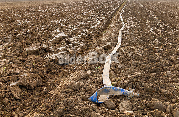 Beschreibung Schlauch zur Bewässerung auf einem Acker, Feldkirchen, Öberösterreich, Österreich