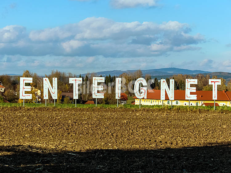 Beschreibung Ein Bauer hat das Wort Enteignet auf seinem Feld aufgestellt.