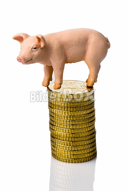 Beschreibung Ein Schwein steht auf einem Stapel Münzen. Steigende Kosten für Futtermittel in der Landwirtschaft. Sinkende Erträge beim Schweinefleisch