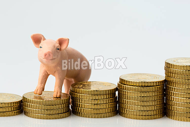 Beschreibung Ein Schwein steht auf einem Stapel Münzen. Steigende Kosten für Futtermittel in der Landwirtschaft. Sinkende Erträge beim Schweinefleisch