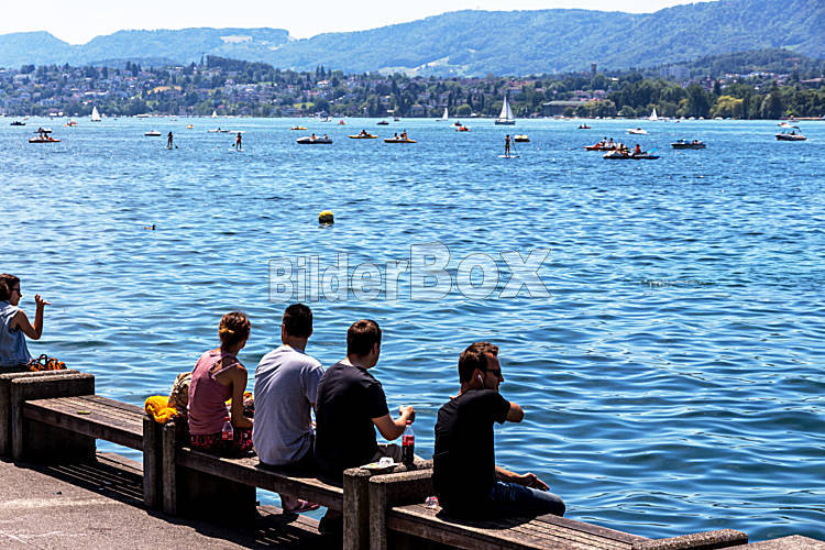 Beschreibung Schweiz, Zürich, Junge Menschen sitzen am Zürichsee