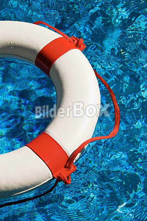Beschreibung Ein weißer Rettungsring mit roten Streifen im blauen Wasser.