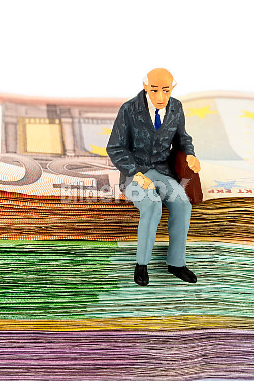 Beschreibung Symbolfoto für Ruhestand und Alterssicherung, Figur eines alten Mannes sitzt auf einem Stapel Banknoten