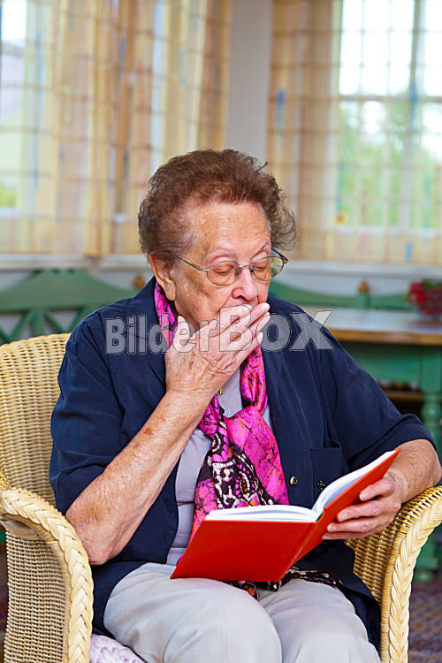 Beschreibung Eine Senioren sitzt in einem Sessel und liest ein Buch