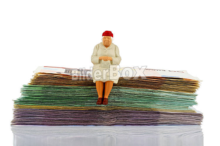 Beschreibung Figur einer alten Frau sitzt auf einem Stapel Geldscheine, Symbolfoto für Rentenversicherung und Ruhesstand