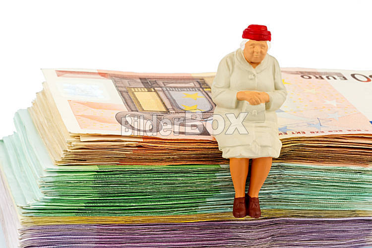 Beschreibung Figur einer alten Frau sitzt auf einem Stapel Geldscheine, Symbolfoto für Rentenversicherung und Ruhesstand