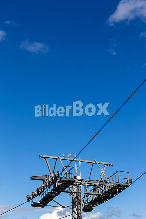 Beschreibung Sessellift und blauer Himmel, Symbol für Transport, Skiurlaub,