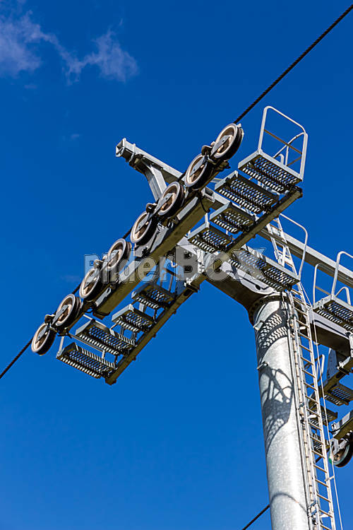 Beschreibung Sessellift und blauer Himmel, Symbol für Transport, Skiurlaub,