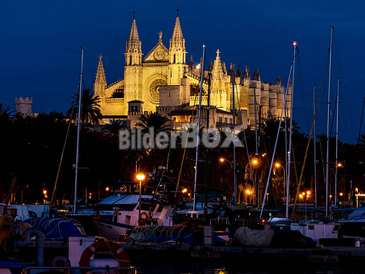 Beschreibung Spanien, Mallorca, Palma. Die Kathedrale "La Seu" als Touristenatrraktion in der Stadtmitte.