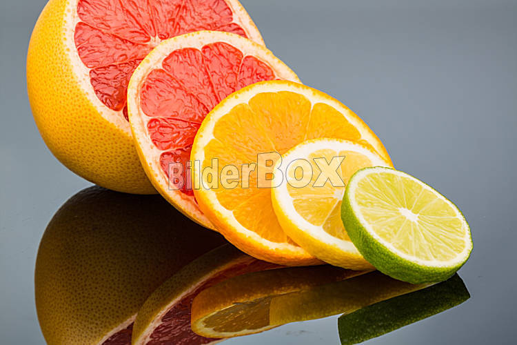 Beschreibung Spiegelung einer Orange. Symbolfoto für gesunde Vitamine durch frisches Obst