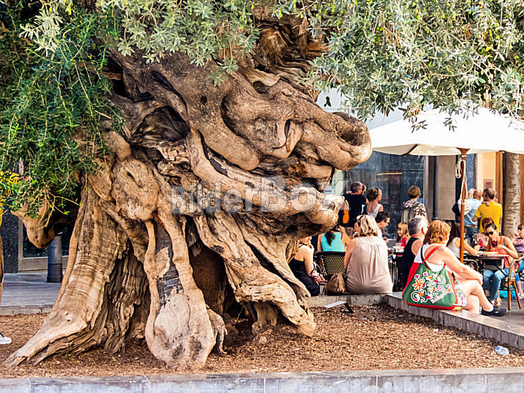 Beschreibung Der Stamm eines sehr alten Olivenbaumes in Palma, Mallorca, Spanien