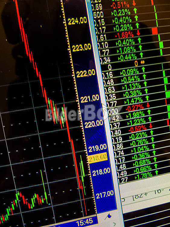 Beschreibung An der Börse fällt der Aktienkurs. Stark sinkende Kurse von Wertpapieren. Verluste von Vermögen bei Aktien.