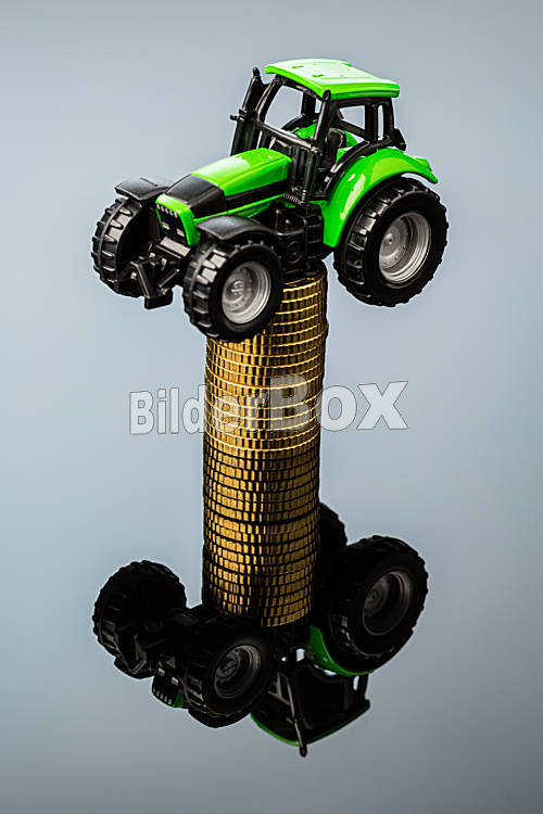 Beschreibung Bauern in der Landwirtschaft haben mit steigenden Kosten zu rechnen. Höhere Preise bei Futter, Dünger und Pflanzen. Traktor mit Münzen