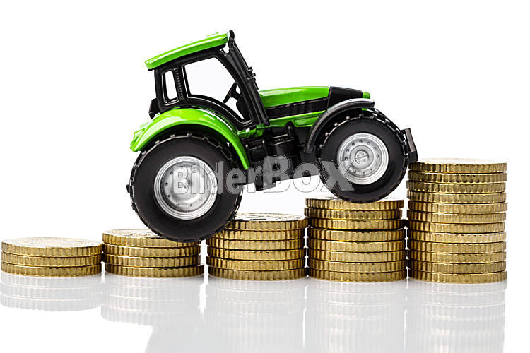 Beschreibung Bauern in der Landwirtschaft haben mit steigenden Kosten zu rechnen. Höhere Preise bei Futter, Dünger und Pflanzen. Traktor mit Münzen