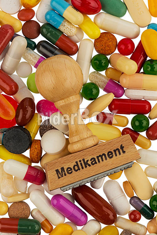 Beschreibung Stempel auf bunten Tabletten, Symbolfoto für Medikamentöse Therapie und Verschreibungspflicht
