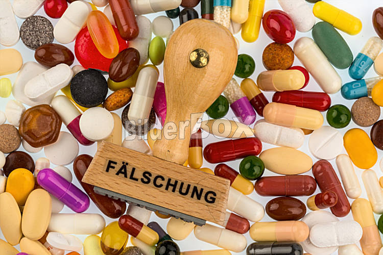 Beschreibung Stempel auf bunten Tabletten, Symbolfoto für Medikamentenfälschung und Produktpiraterie