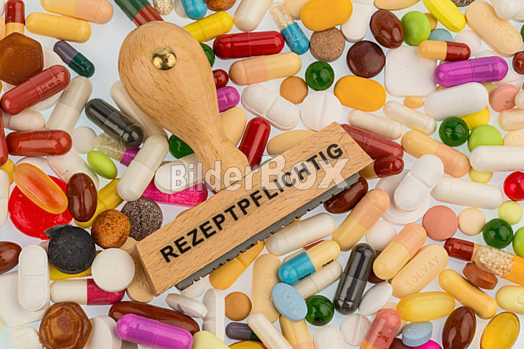 Beschreibung Stempel auf bunten Tabletten, Symbolfoto für Medikamente, Rezeptflicht und Zuzahlung