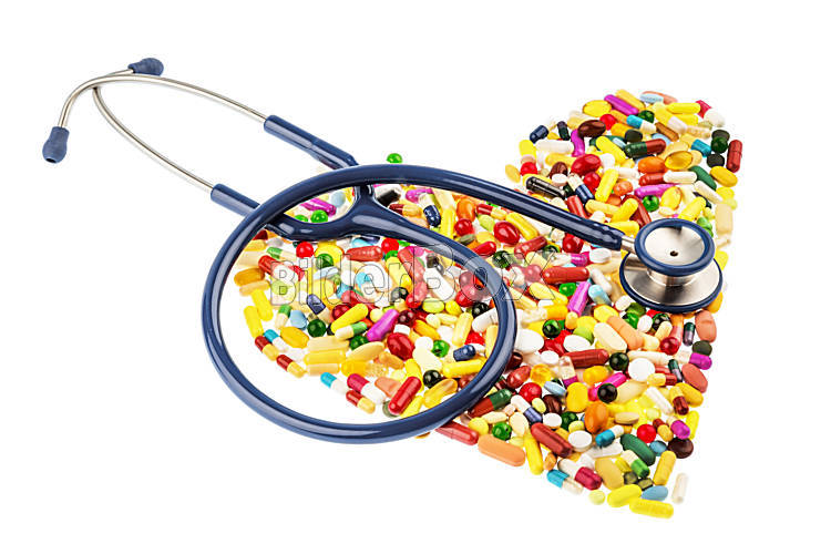 Stethoskop und Pillen in Herzform