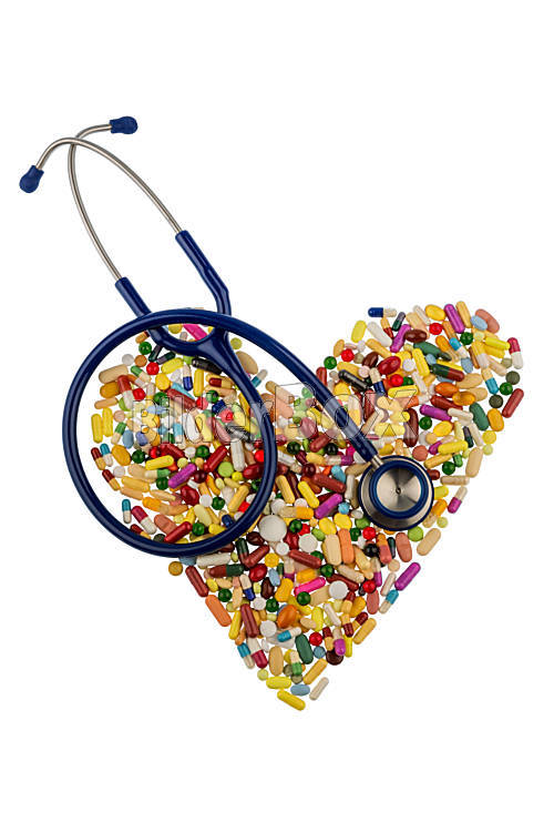 Beschreibung Stethoskop und Tabletten in herzförmiger Anordnung, Symbolfoto für Herzkrankheiten, Diagnostik und Medikation