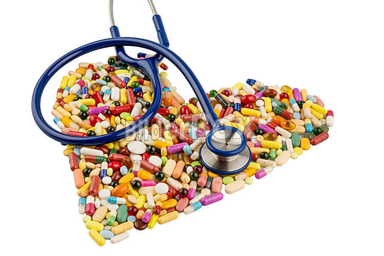 Stethoskop und Pillen in Herzform