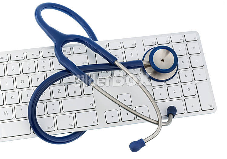 Beschreibung Stethoskop und Tastatur eines Computers, Symbolfoto für Diagnostik und Terminverwaltung