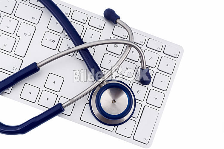 Beschreibung Stethoskop und Tastatur eines Computers, Symbolfoto für Diagnostik und Terminverwaltung