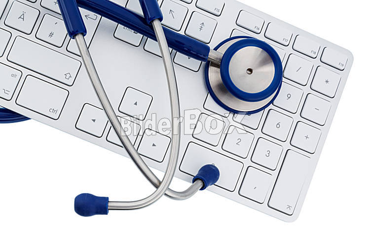 Beschreibung Stethoskop und Tastatur eines Computers, Symbolfoto für Diagnostik und Terminverwaltung