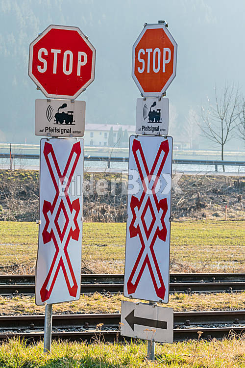 Beschreibung Stopschilder Bahnübergang Pfeifsignal, Symbol für Schienenverkehr, Gefahr, Sicherheit