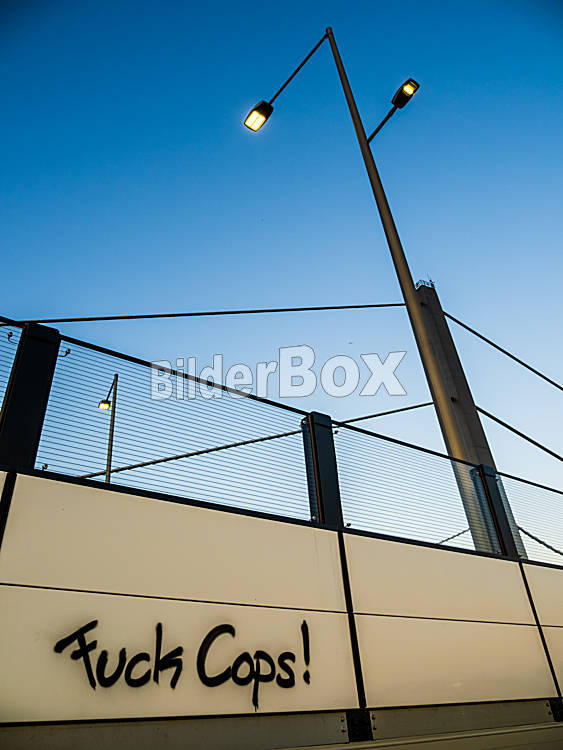 Beschreibung Straßenbeleuchtung auf den neuen Bypässen der Voestbrücke in Linz. Aufschrift Fuck Cops. Polizei . Polizisten