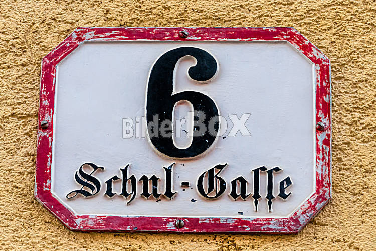 Beschreibung Schulgasse. Schild einer Straßenbezeichnung und Hausnummer