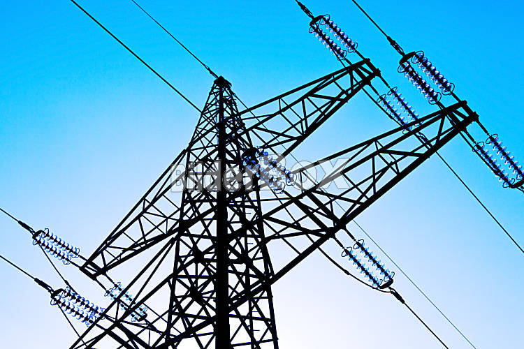 Beschreibung Der Masten einer Stromleitung vor blauem Himmel. Hochspannungsleitung
