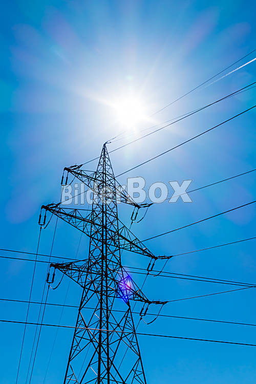 Beschreibung Der Strommast einer Hochspannungsleitung. Symbolfoto für Energie. Vor blauem Himmel
