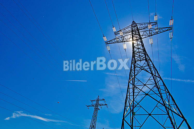 Beschreibung Ein Strommast einer Hochspannungsleitung mit Sonne vor blauem Himmel
