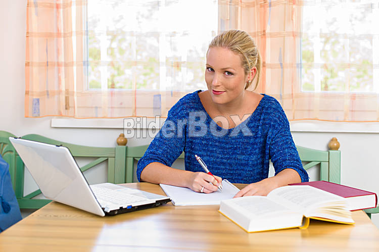 Beschreibung Eine junge Studentin beim lernen für ihr Studium in ihrer Wohnung.