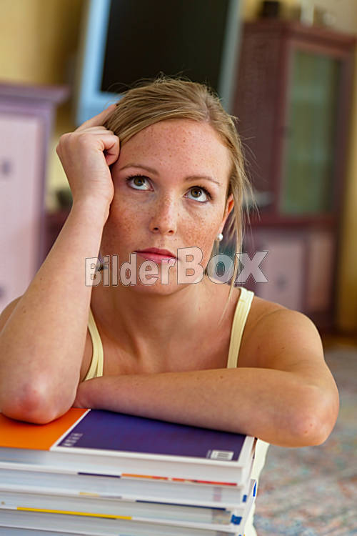 Beschreibung Eine Studentin sitzt vor einem Stapel Bücher beim lernen