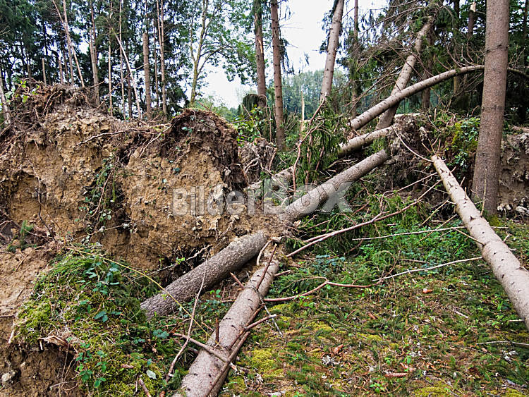 Beschreibung Sturmschaden. Umgestürzte Bäume im Wald nach einem Sturm.