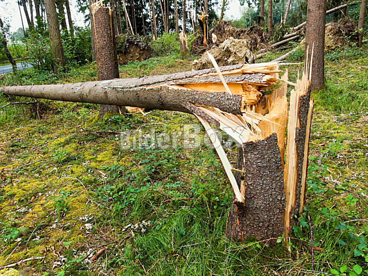 Beschreibung Sturmschaden. Umgestürzte Bäume im Wald nach einem Sturm.
