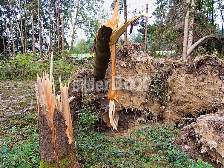 Beschreibung Sturmschaden. Umgestürzte Bäume im Wald nach einem Sturm.