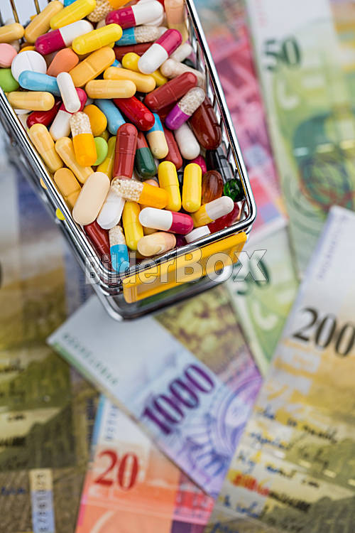 Beschreibung Tabletten, Einkaufswagen, Schweizer Franken, Symbolfoto für Medikamente, Krankenkassen, Kosten im Gesundheitswesen