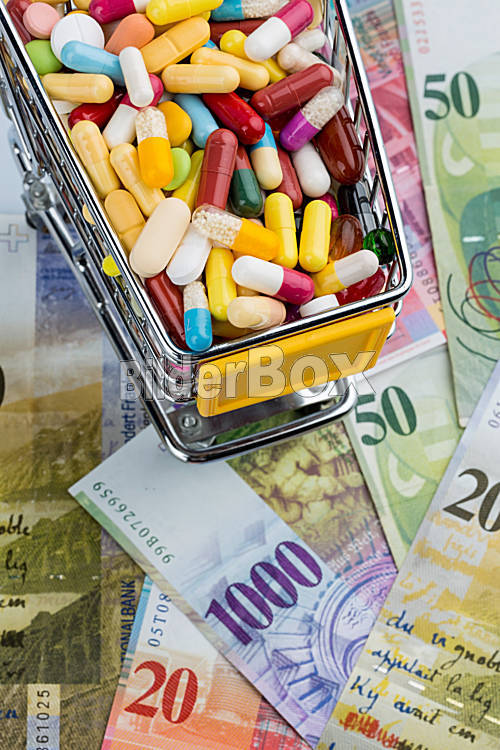 Beschreibung Tabletten, Einkaufswagen, Schweizer Franken, Symbolfoto für Medikamente, Krankenkassen, Kosten im Gesundheitswesen