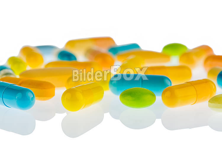 Beschreibung Viele Tabletten liegen auf einem hellen Hintergrund. Symbolfoto für Medizin und Medikamente der Pharmaindustrie