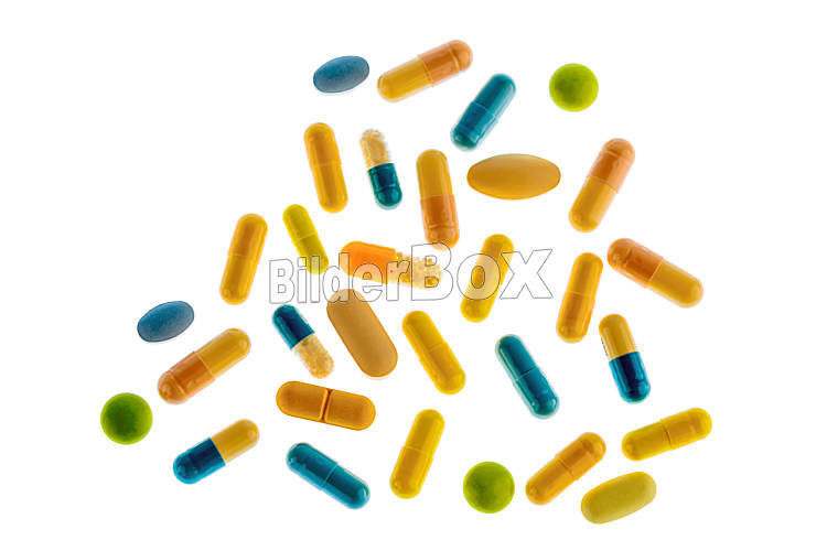 Beschreibung Viele Tabletten liegen auf einem hellen Hintergrund. Symbolfoto für Medizin und Medikamente der Pharmaindustrie