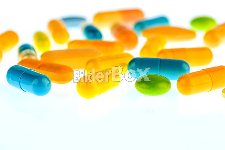 Beschreibung Viele Tabletten liegen auf einem hellen Hintergrund. Symbolfoto für Medizin und Medikamente der Pharmaindustrie