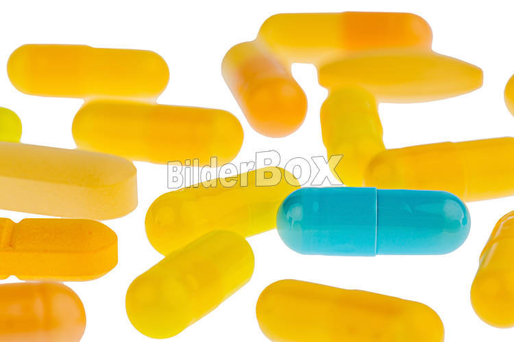 Beschreibung Viele Tabletten liegen auf einem hellen Hintergrund. Symbolfoto für Medizin und Medikamente der Pharmaindustrie