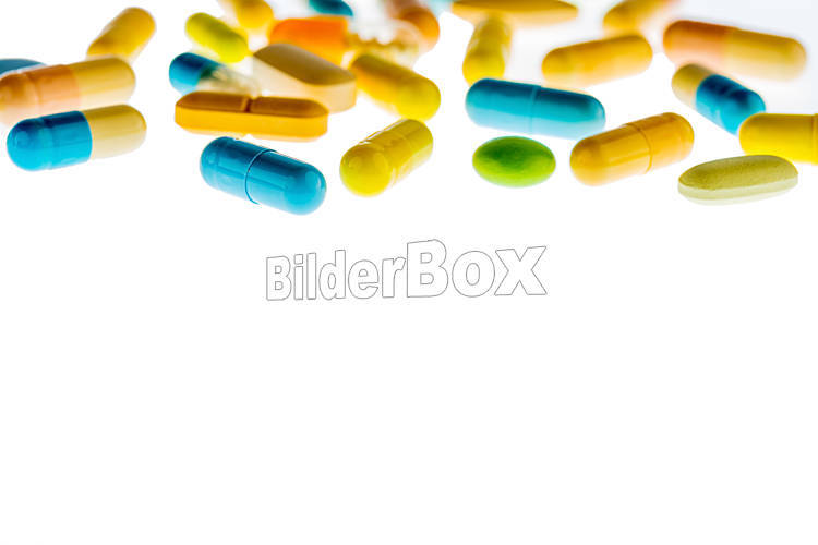 Beschreibung Viele Tabletten liegen auf einem hellen Hintergrund. Symbolfoto für Medizin und Medikamente der Pharmaindustrie