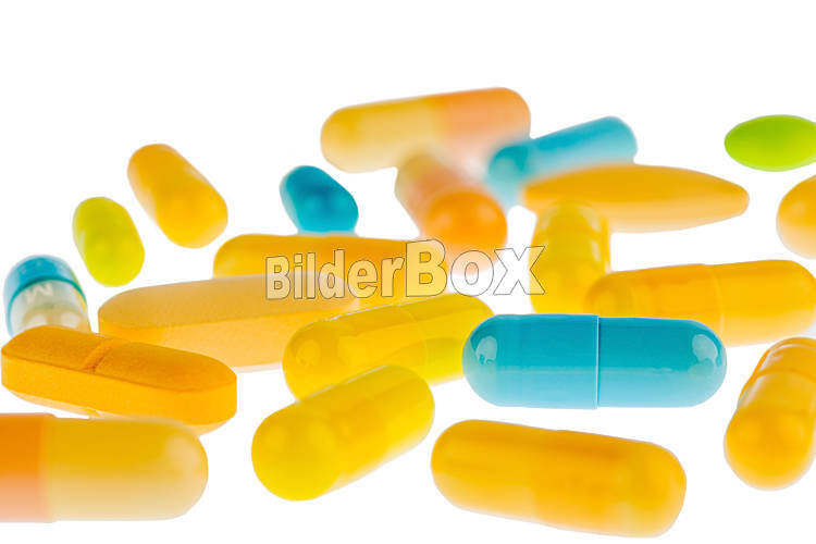 Beschreibung Viele Tabletten liegen auf einem hellen Hintergrund. Symbolfoto für Medizin und Medikamente der Pharmaindustrie