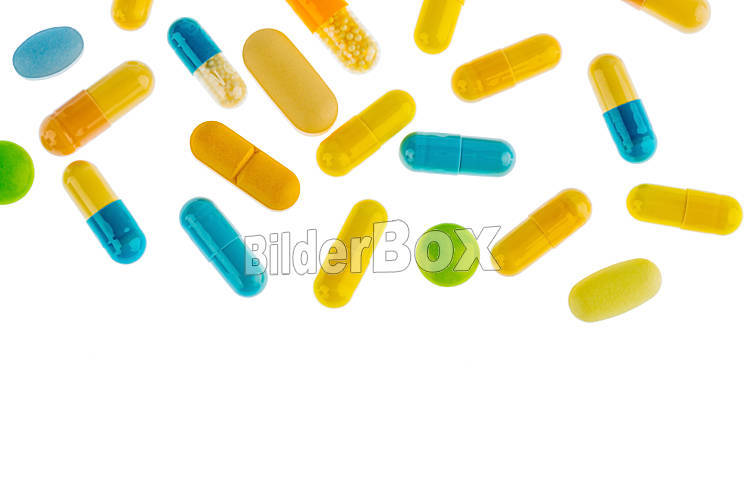 Beschreibung Viele Tabletten liegen auf einem hellen Hintergrund. Symbolfoto für Medizin und Medikamente der Pharmaindustrie