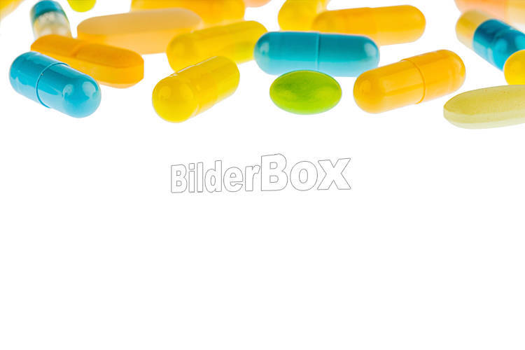 Beschreibung Viele Tabletten liegen auf einem hellen Hintergrund. Symbolfoto für Medizin und Medikamente der Pharmaindustrie
