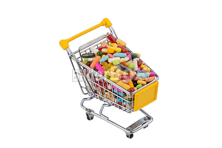 Beschreibung Tabletten mit Einkaufswagen. Symbolfoto für den Einkauf von Medikamenten im Internet