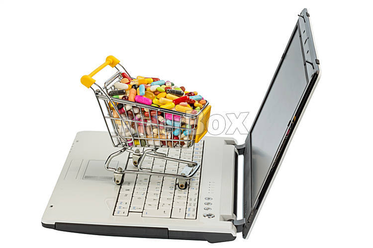 Beschreibung Tabletten mit Einkaufswagen und Computer. Symbolfoto für den Einkauf von Medikamenten im Internet